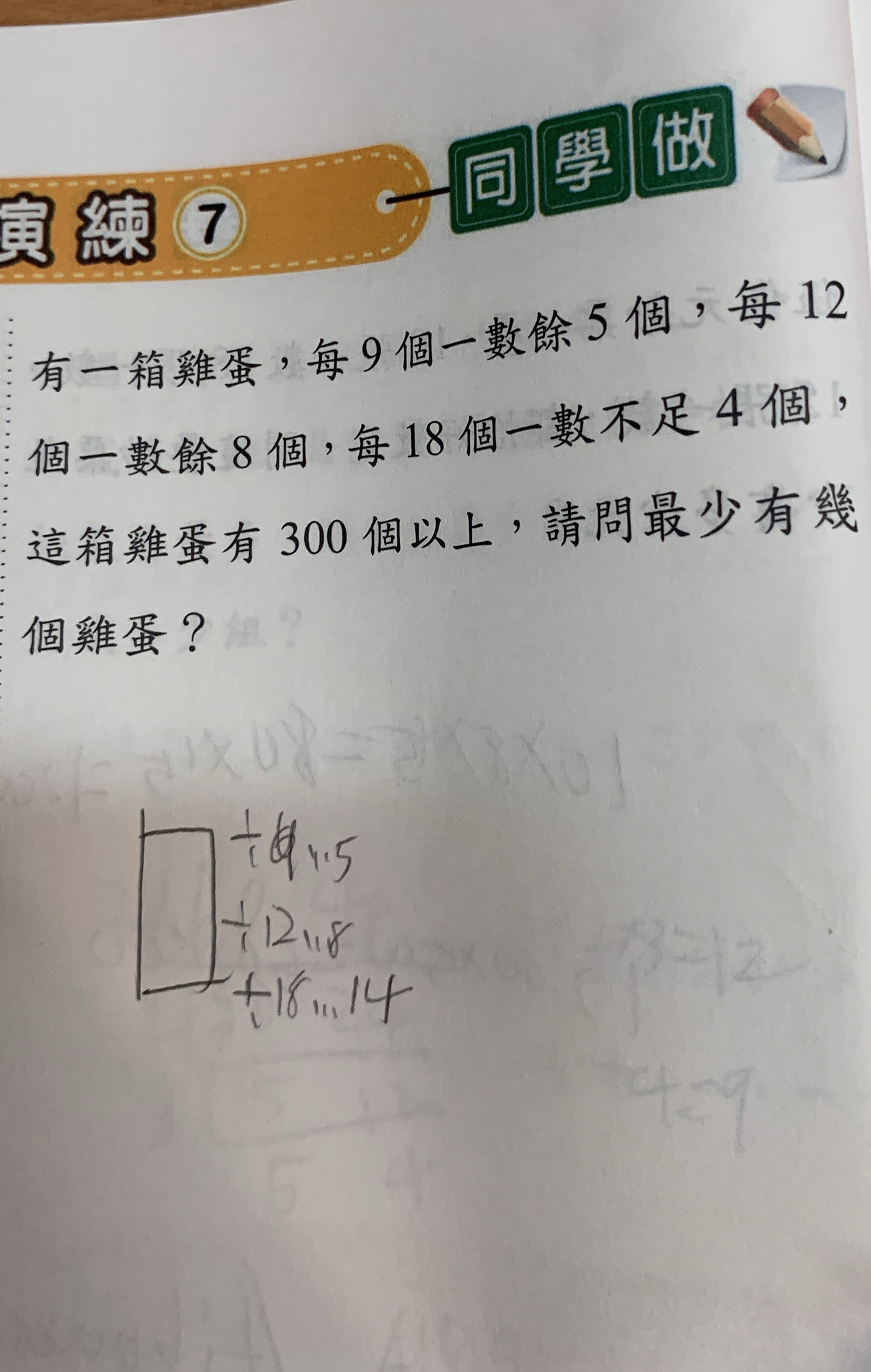 有一箱雞蛋,每九個一數餘五個,每十二個一數餘八個,每十八個一數不足四個,這箱雞蛋有300個以上,請問最少有幾個雞蛋?