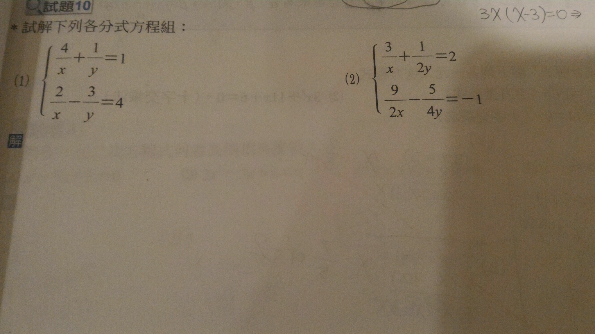 題目出處: 翰林 高中數學銜接教材,解分式方程組 試題 10 (1) (2)。