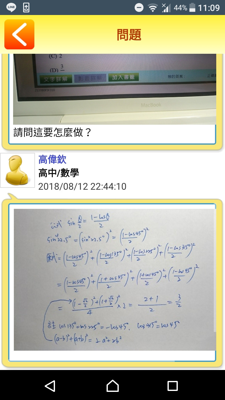 解答中的(sin平方22.5°)的平方=(1-cos45°/2)的平方, 請問為什麼sin平方22.5°=1-cos45°/2 而不是sin平方22.5°=1-cos平方45°/2 1-cos平方=sin平方不是嗎??