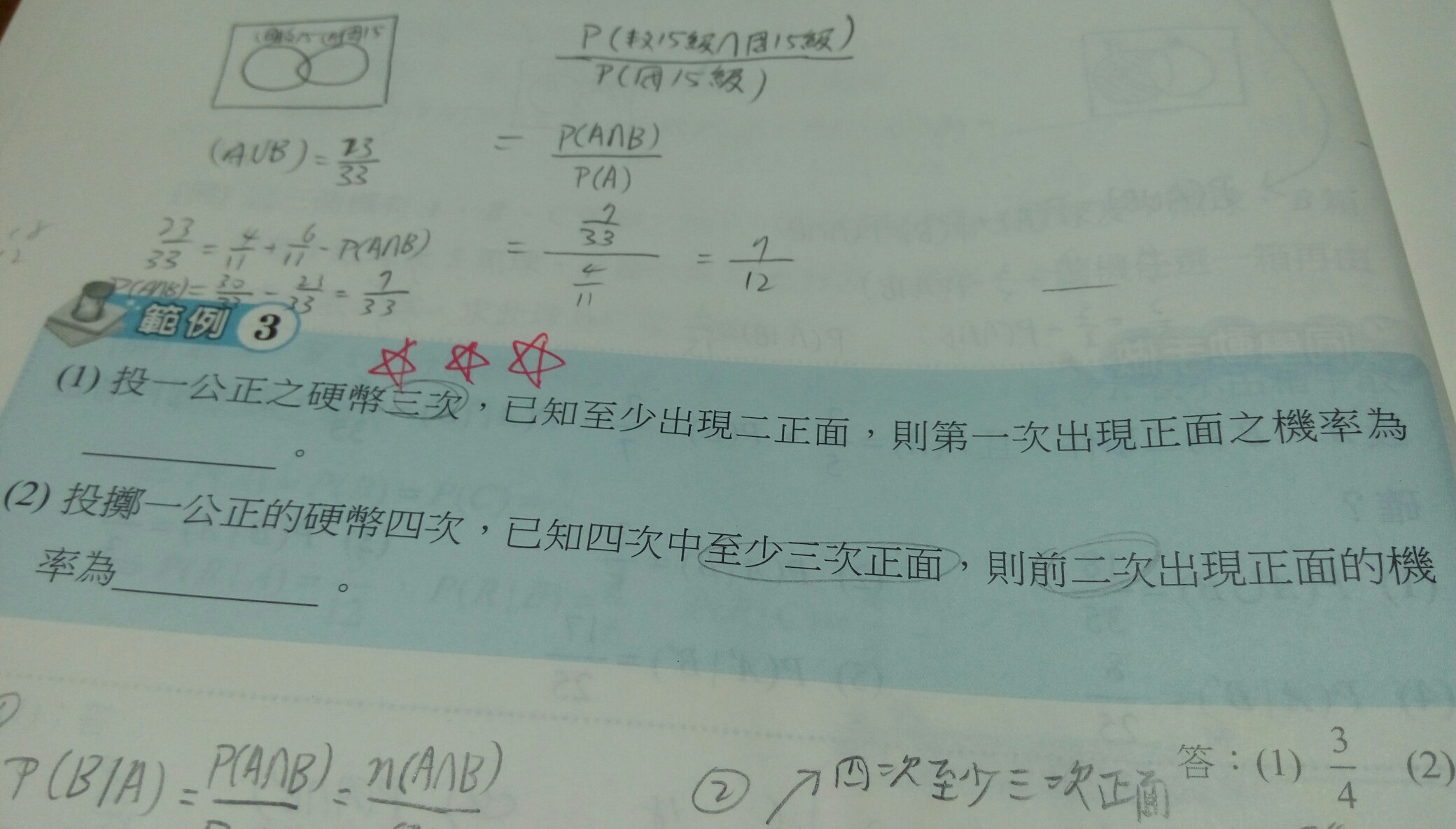 2 四次至少有三次正面 是(C4取3/2⁴)+1(全正面) 還是(C4取3*½*½)/2⁴+1 為什麼?
