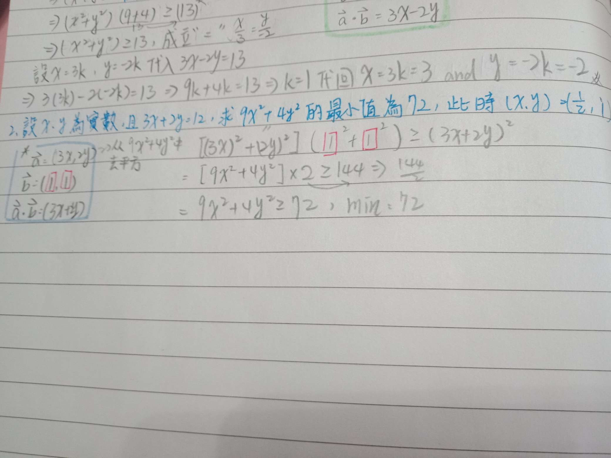 柯西不等式中最小值求出72了但帶入向線b求不出(x,y)
