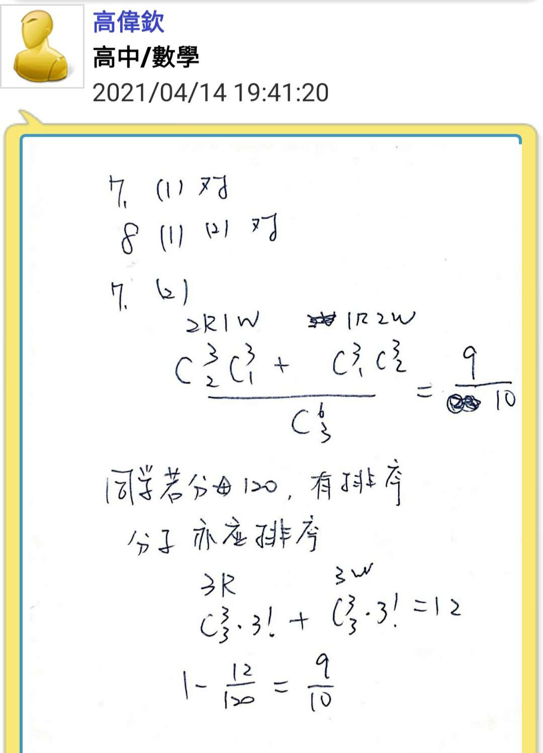 我想問兩個問題 1.剛剛第七題第二小題的問題敘述是否暗示不需排列?(因為很多時候題目的敘述並不會明講,需要經驗的累積才看得出來,這個想法有誤的話,可以告訴我嗎?謝謝你) 2.請從「同學若分母120,有排序,分子亦需排序」那邊開始看,如果硬要排序,是否有修改題目的意味?(此問題承載第一題,如果我不明白它的「暗示」,分子分母都排列,那這算不算竄改題目) 指定:高偉欽 老師 作答(因為這個問題只有這位老師才能完全瞭解我的意思)
