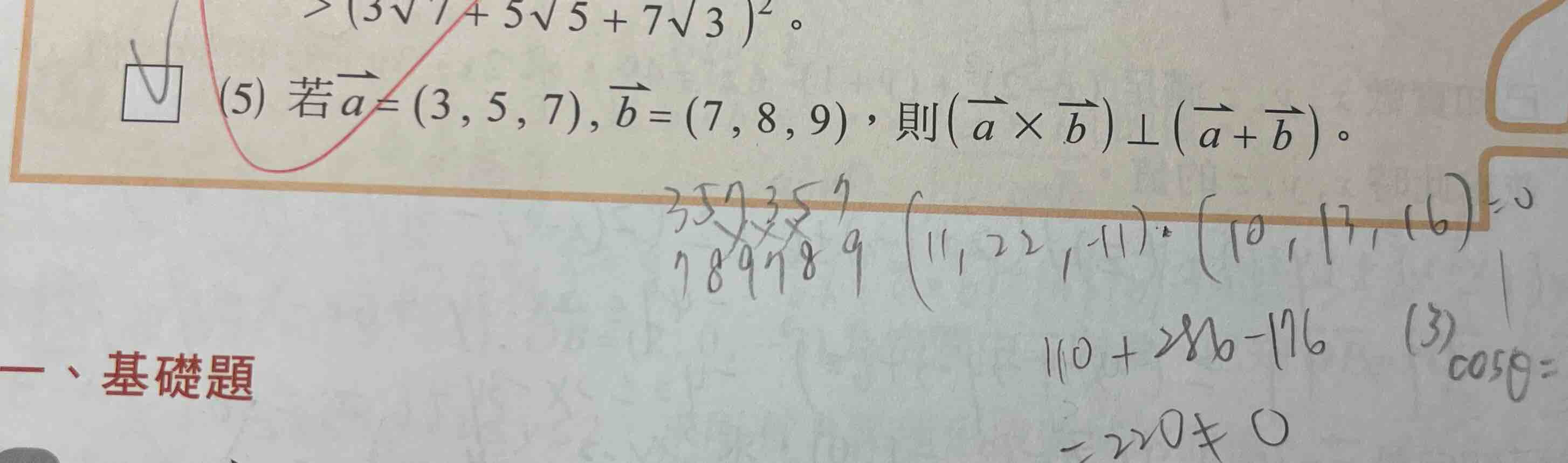 為什麼(5)是對的 我先算出ab 的外積,再算了a+b,最後讓他們用內積的算法使他們等於0,可是算出來答案是220並不等於0,是哪裡做錯了?