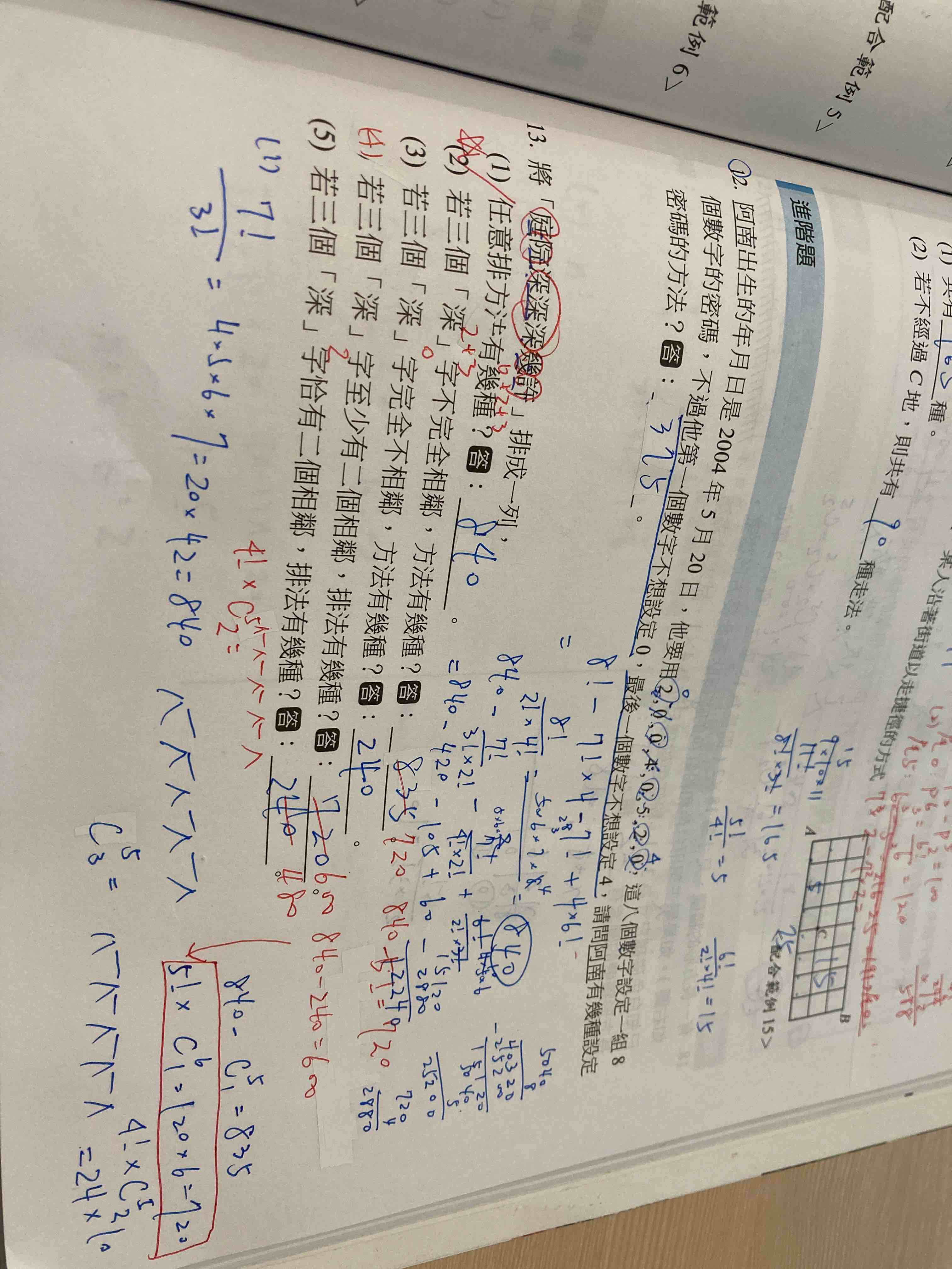呈上個問題(第四題(上個問題沒打完 為何不能用我紅筆拉過去的框起來的算法算 為何第五題不能用四階乘乘上C5取2(一邊個放一個深一邊放兩個深) 謝謝老師