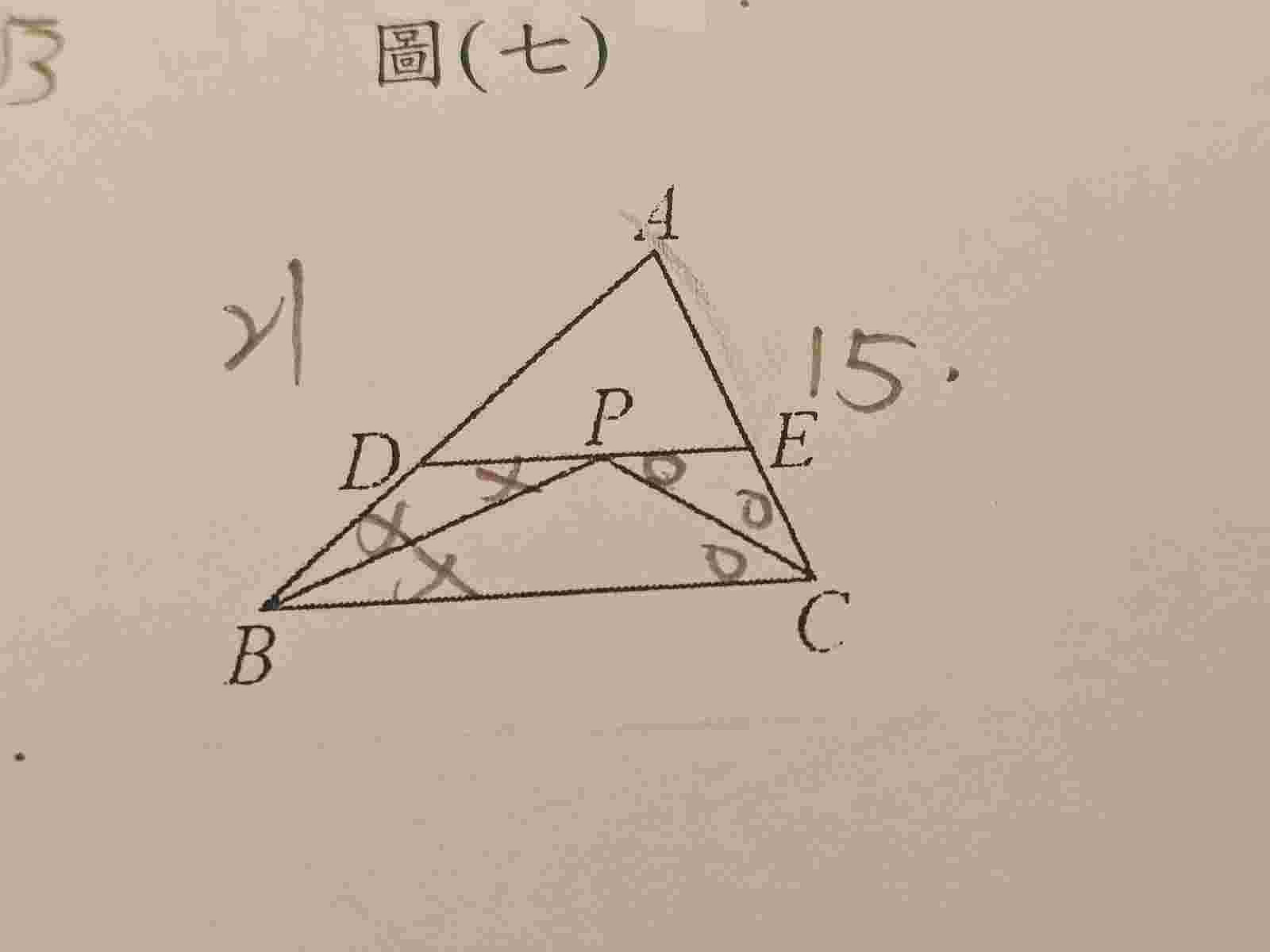 如右圖,△ABC中,∠ABC、∠ACB的角平分線相交於P點,若過P點作BC的平行線交 AB、AC於D、E兩點,且AB=21,AC=15,則△ADE的周長 為多少?